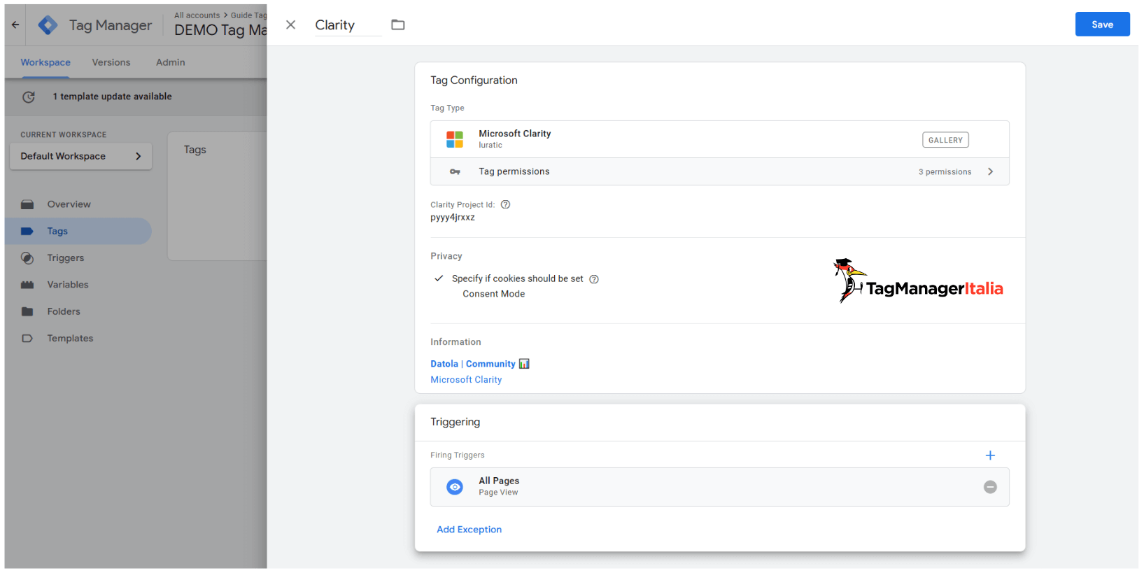 dai un nome al tag (ad esempio “Clarity”) e clicca su Save