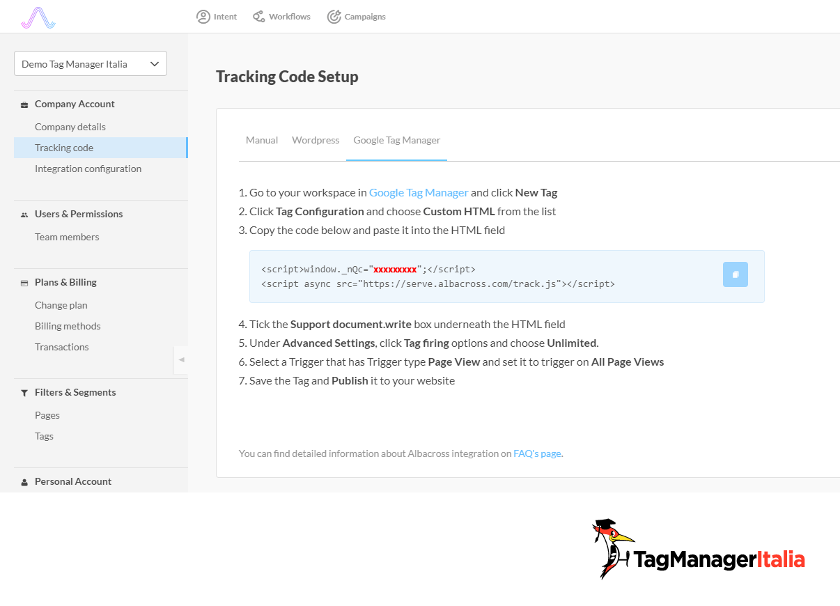 Lo trovi anche nella documentazione ufficiale di Albacross: http://help.albacross.com/general/how-to-install-albacross-tracking-code.
