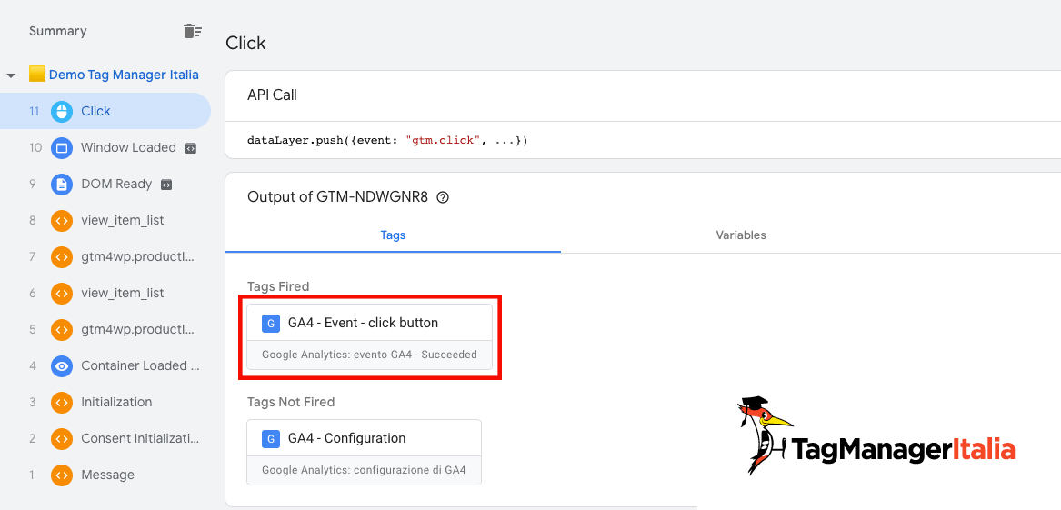 All’inizio vedrai il Tag “GA4 – Event – Click Button” sotto i Tags Not Fired.