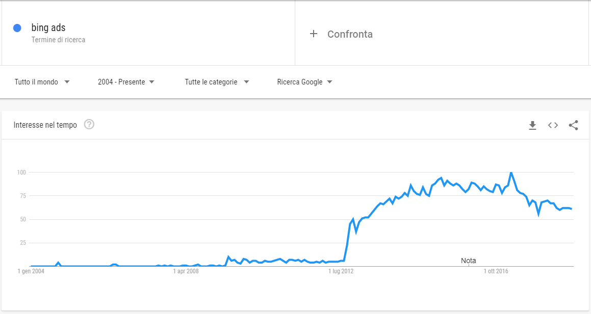 Innanzitutto ti spiego cosa è: Bing Ads è l’equivalente di Google AdWords per Bing, il motore di ricerca di Microsoft. Sì, sono d’accordo con te, in Italia sicuramente è Google a farla da padrona ancora ma… dai un’occhiata a questi dati di Google Trends: