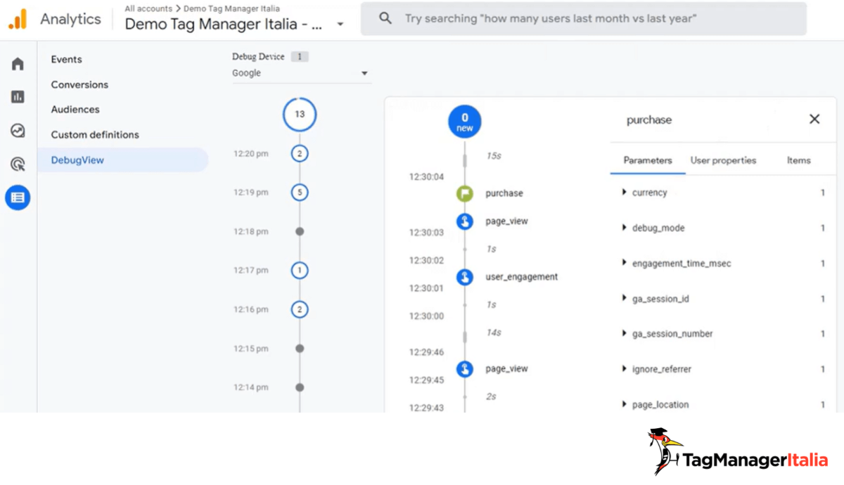Verifica che tutto funzioni correttamente con la Modalità Debug (Anteprima) di Google Tag Manager e il DebugView di Google Analytics 4.